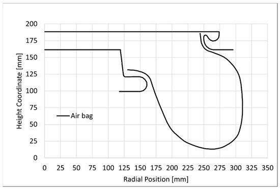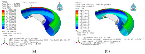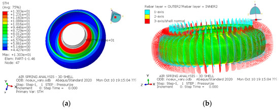 The angle at the maximum radial position of the airbag was measured as 16 degrees. For the constant angle model, 16 degrees was set based on the maximum angle of the airbag. In order to obtain the angle calculated for each position, 267 mm, which is the radius of the upper bead, was used for the initial radial position, and 11 degrees was used for the initial angle to set the maximum angle of the airbag to 16 degrees. Using Equation (3) with the Poisson’s ratio of 0.5, the ply angle with respect to the radial position was obtained, as shown in Figure 3. The result of applying the angle to the rebar element is shown in Figure 11b using a vector.