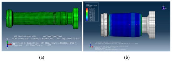In addition to the changes in the manufacturing process, angle change also occurs during inflation and deformation. Pressurization and deformation analysis were performed on the sleeve-type airbag to verify that it fits well in the operation of the airbag. The analysis model is the same as that used by the authors of [10] for the passenger-car model. In this analysis, the reinforced fibers are modeled as rebar elements, and, as shown in Figure 6, the initial airbag has the same radius in the longitudinal direction, so it is easy to input according to the initial ply angle. Therefore, it is possible to check the change of the angle according to the analysis. In Figure 6b, which is a deformed shape, the ply angle change of five points was traced from the point close to the piston in the +x direction to the lower base.