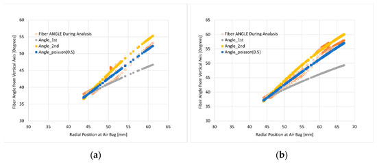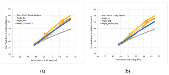 The hollowed dot symbols in Figure 7 indicate the change of ply angle in the simulation as a radial position for the five points tracing the angle. Among the angle calculation equations, Figure 7 shows the case of Poisson’s ratio of 0.4 and 0.5 in Equation (3). Equation (1) has a large difference as the radial position increases, and Equations (2) and (3), using Poisson’s ratio, are considered to fit the change of ply angle well in the analysis. In particular, the Poisson’s ratio of 0.5 agrees better with the analyzed value.