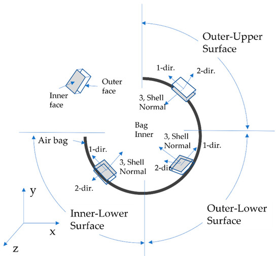 If the global origin is set as the origin of the cylinder coordinate system and the +y-axis is set as the reference axis, the direction 1 of the rebar element will change in two out of three areas, as shown in Figure 9. That is, in the Outer-Upper region and the Outer-Lower region, the normal vector of the shell element is in the −x direction, and in the Inner-Lower region, the direction 1 is opposite to the +x direction. Therefore, based on the longitude line, the rebar angle is 180 degrees different between the Outer-Upper or the Outer-Lower region and the Inner-Lower region. That is, if the ply angle based on the longitude line is set at ±16 degrees, it becomes 90 ± 16 degrees in the Outer-Upper or Outer-Lower region, and 270 ± 16 degrees in the Inner-Lower region.
