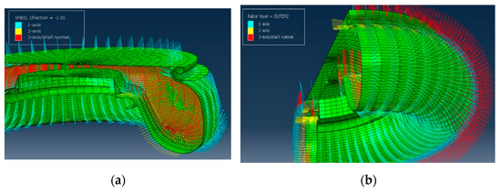 Figure 10 shows the direction vector of the rebar element when the rebar element is used. Figure 10a shows the case where the ply angle is 0 degrees, and the sky-blue color indicates the fiber direction of the ply. Figure 10b shows the case where different ply angles are set for each position, and direction 2 (yellow color vector) is opposite to each other at the Outer-Lower region and Inner-Lower region interfaces.