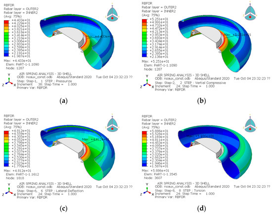 Distribution of rebar force (RBFOR) during analysis at constant ply angle distributions: (a) inflation; (b) vertical compression; (c) lateral deflection; (d) torsional rotation.