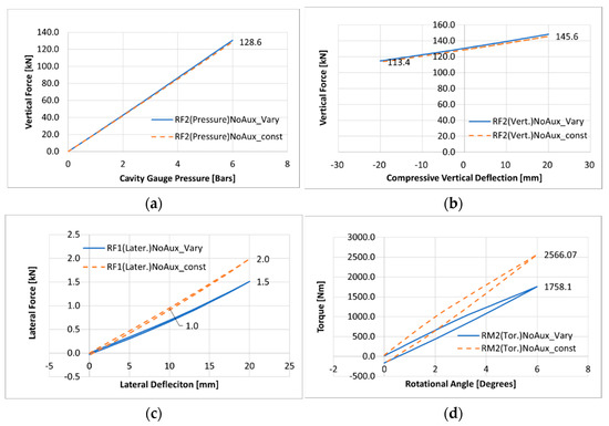The characteristic diagram of the air spring is shown in Figure 14. As the internal pressure increases, the vertical force increases. In both cases, similar values are shown. When the internal pressure was 6 bars and the air flow was locked and the pressure was changed according to the volume, then vertical, lateral, and rotational loads were applied. In the case of vertical compression, there is not much difference between the two cases, but the lateral and rotational directions are significantly different. In the case of a constant angle, the reaction force/moment curve appears high in lateral deflection and rotational torsion, and the reaction force curve appears low in vertical load.