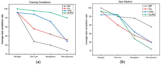 From the results of Table 6 and Table 7, the car driving environment under turning conditions is relatively simple, and when the training conditions are the same, the model in this paper is basically able to drive through the whole section of the road, and the number of collisions is also low; in other weather conditions there is a slight decline, but due to the existence of advanced control commands, the model in this paper is less sensitive to the weather when the weather changes, and it can complete the driving task excellently. Adaptation ability decreases significantly, a part of the task volume will be lost, and the number of collisions also increases significantly, which is because the change in the urban environment will cause the structure of the image to change, and the algorithm will not extract enough information about the features with greater recognition degree, which affects the neural network’s judgment of the recognition results.