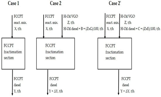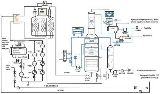 Table 3 presents data of the material balance of the LNB FCC feed hydrotreating section (called also FCC pretreater) for both studied cases in this research: Case 1—without processing H-Oil heavy distillates (VGO = vacuum gas oil); and Case 2—with processing H-Oil VGO. The data in Table 3 indicates that the processing of 39 t/h H-Oil VGO blend resulted in 3.4 t/h higher amount of produced diesel fraction from the FCC feed hydrotreating section. This equals to 8.7 wt.% of the H-Oil VGO processed in the FCCPT stabilization column.