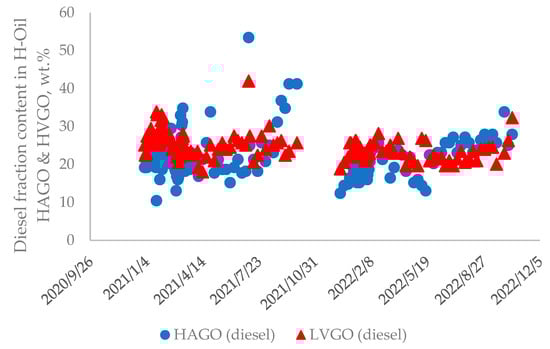Variation of diesel fraction content (boiling ≤ 360 °C) in H-Oil HAGO, and LVGO.