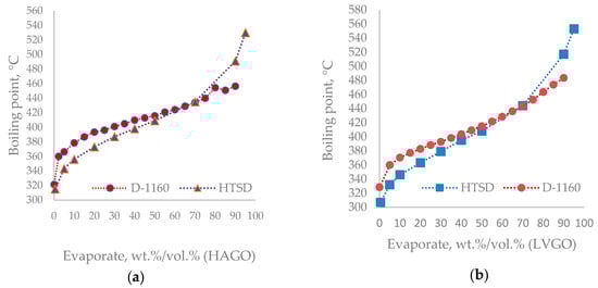 HTSD and physical vacuum distillation (ASTM D 1160) data for H-Oil HAGO (a), and LVGO (b).