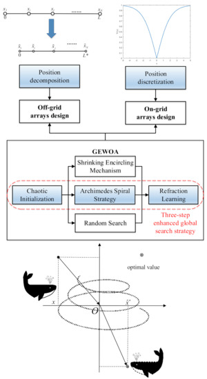 , and then the proposed GEWOA is performed to obtain the optimized design result. For on-grid array design, GEWOA is directly performed to update the positions of the population, and then a V-shaped transfer function is used to map the search positions into the discrete grid points to obtain the desired array.