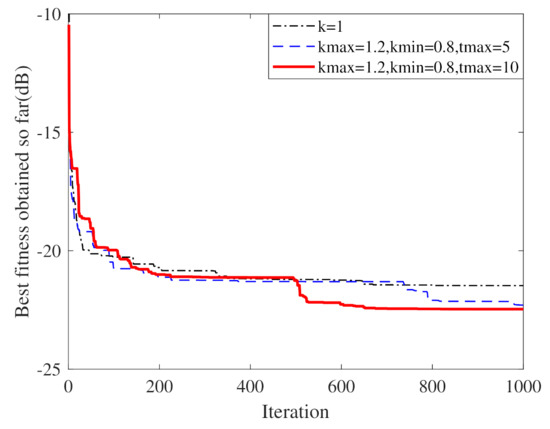 The basic design requirements in numerical experiments are as follows. The array aperture is 200 m, the number of array elements is 40, and the array operating frequency is 300 Hz with a wavelength of 5 m. The objective function is shown in (2), where PSLL is chosen as the evaluation criterion. The number of whales in the population , the dimension of search , the number of iterations .