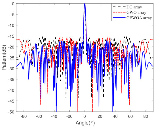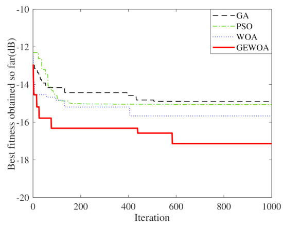 Figure 10. It can be seen that the PSLL of array without RL optimization is −21.02 dB, and the PSLL of array with RL optimization is −22.47 dB. Compared with WOA, the PSLL obtained by GEWOA is reduced by 3.81 dB.