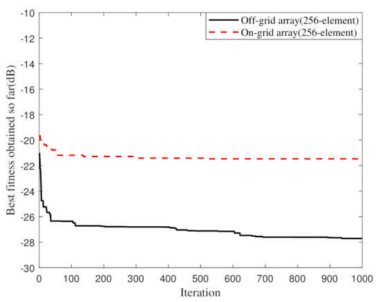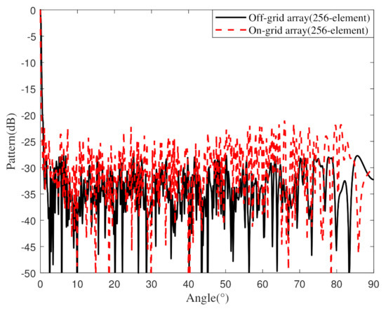 Figure 16, respectively. The results show that the PSLLs of the off-grid array and the on-grid array obtained by the proposed methods are −27.71 and −21.47 dB, which verifies the feasibility of the algorithm in large-scale low-frequency array design.