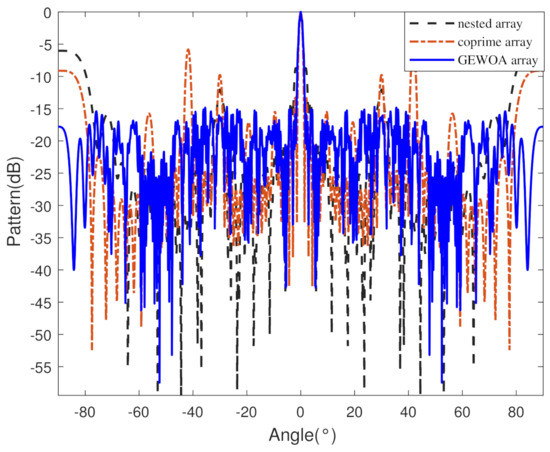 Figure 17 shows the beampatterns of the three arrays. It can be seen that the PSLL of the array designed using GEWOA are −14.79 dB, and the PSLLs of the coprime array and the nested array are −5.82 and −6.02 dB, respectively. The main lobe widths of three arrays are approximately the same. However, the sparse array designed using GEWOA has a lower PSLL, which proves the advantage of the proposed method compared with the determined methods.