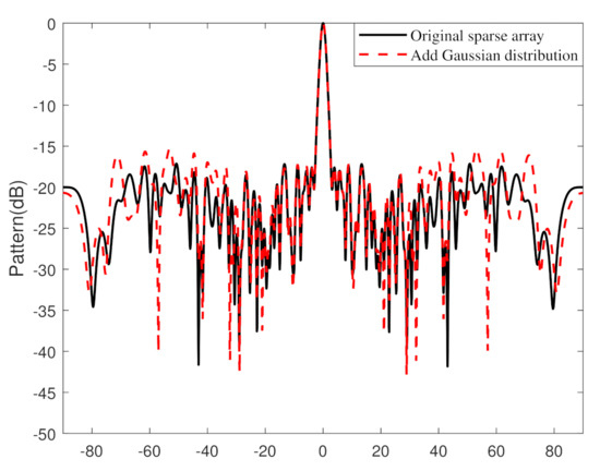 Figure 21. It can be seen that the PSLL of the designed array is −17.58 dB, while the PSLL of the array is −15.87 dB in the case of perturbation of all array elements. We performed 100 experiments using Monte Carlo simulations. The average value of PSLL for the position perturbation case is 16.23 dB. A quarter-wavelength Gaussian position perturbation causes the PSLL of the array to degrade by about 1.35 dB.