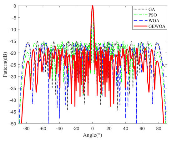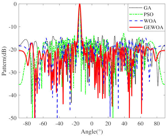 Figure 14, respectively. The PSLLs of GA, PSO, WOA, and GEWOA are −14.90, −15.10, −15.66, and −17.14 dB, respectively. It can be seen that the on-grid array designed using GEWOA obtains the lowest PSLL, which proves the advantage of the GEWOA in terms of the global search capability.