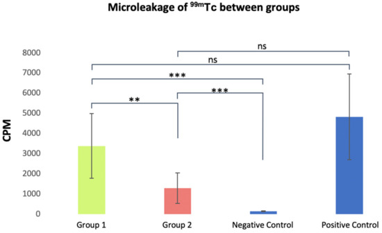- Carrilho, E.; Abrantes, M.; Paula, A.; Casalta-Lopes, J.; Botelho, M.; Ferreira, M. Microleakage Study of a Restorative Material via Radioisotope Methods. Rev. Port. Estomatol. Med. Dentária Cir. Maxilofac. 2014, 55, 129–134. [Google Scholar] [CrossRef]