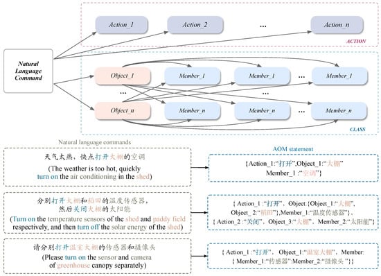 - Basic natural language commands (a): Natural language commands that do not contain any nested, parallel, or other complex relationships, such as “请帮我打开大棚的吊灯” (“Please help me turn on the chandelier in the shed”), the generated AOM statement is {Action_1: “打开” (“turn on”), Object _1: “大棚” (“shed”), Member_1: “吊灯” (“chandelier”)}, in the form of a single keyword for each attribute.