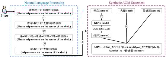 - Step (6) represents the process of synthesizing the AOM statement, which automatically fills the corresponding slot with the extracted key information, and finally converts the natural language command “请帮我开启大棚的传感器” (“Please help me turn on the sensor of the shed”) into the AOM statement {Action_1: “打开” (“turn on”), Object_1: “大棚” (“shed”), Member_1: “传感器” (“sensor”)}.