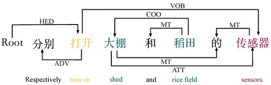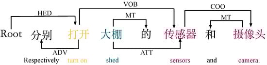 Member-parallel natural language commands (d): For example, the dependency of command type d ”分别打开大棚的传感器和摄像头“(”turn on the sensor and camera of the shed separately”) is shown in Figure 5. In this case, “传感器” (”sensor”) and “摄像头” (“camera”) are in a concurrent relationship (COO). First, we can see from the diagram that the semantic dependency between “大棚” (“shed”) and “传感器” (“sensor”) is a neutral relationship, and we determine the first object attribute “大棚” (“shed”) based on this property and automatically populate it into Object_1 as the first object. Next, the semantic dependency between the verb “打开” (“turn on”) and “传感器” (“sensor”) is a verb–object relationship (VOB), with the arrow pointing from “打开” (“turn on”) to “传感器” (“sensor”). Therefore, “传感器” (“sensor”) can be extracted as the first member through the verb–object relationship and automatically filled into Member_1. Next, we determine “摄像头” (“camera”) as the second member to be populated in Member_2 according to the concatenation relationship (COO). Finally, “打开” (“turn on”) is automatically populated as the first action attribute in Action_1 by using the same verb–object relationship. {Action_1: “打开”’ (“turn on”), Object_1: “大棚” (“shed”), Member:{ Member_1: “传感器” (“sensor”). Member_2: “摄像头” (“camera”)}}. The algorithm describing the process of extracting this key information is shown in Algorithm 3.