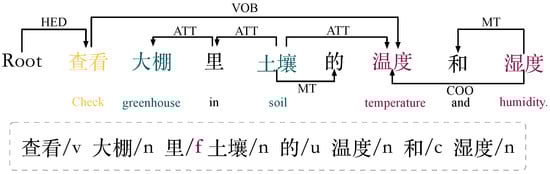 Object nested natural language commands (e): For example, the dependency of the command type e “查看大棚里土壤的温度和湿度” (“check the temperature and humidity of the soil in the shed”) is shown in Figure 6, which describes the idea of nesting objects. As we can see, “温度” (“temperature”) and “湿度” (“humidity”) are members of the object “土壤” (“soil”), and the user needs to complete the operation to check the temperature and humidity of the soil, but “土壤” (“soil”) is modified by “大棚” (“shed”), which means that the “土壤” (“soil”) is the soil of the “大棚” (“shed”). Therefore, “大棚” (“shed”) and “土壤” (“soil”) form a nested object relationship, and “大棚” (“shed”) can be identified as the first object, pointing to the second object “土壤” (“soil”). For example, the command “查看大棚里空调旁边传感器的二氧化碳的值” (“Check the CO2 value of the sensor next to the air conditioner in the shed.”) contains the user’s intention to check the carbon dioxide content, and the first object described in the middle can be identified as Object_1: “大棚” (“shed”) pointing to the second object Object_2: “空调” (“air conditioner”), and then points to the third object Object_3: “传感器” (“sensor”).