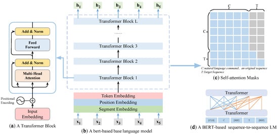 The architecture of the proposed BERT-based Seq2Seq language model is shown in Figure 7. From Section 4.2.1, we know that the self-attention mechanism is Q, K, and V, and they are all the same vector sequence after linear changes, while Transformer is the combination of self-attention and Position-Wise fully connected layers, and Transformer is based on the attention vector sequence to vector sequence change. Therefore, this subsection analyzes the NL2AOM task in terms of the language model, the mask approach of the attention matrix, and how to use the BERT pre-trained model to build a natural language interface with scientific generalization capability and extensibility.