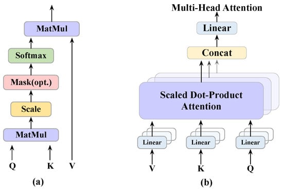 The attention mechanism is widely used in various tasks of natural language processing based on deep learning, and the self-attention mechanism has become a hot research topic of neural network attention. The calculation process of attention and multi-head-attention are shown in Figure 8a,b. The calculation formula of attention is shown below.