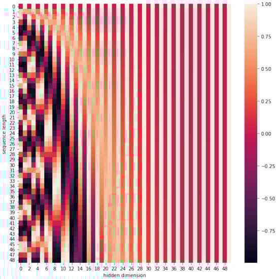 The location-embedding matrix is shown in Figure 9, and to clearly describe this variation, we define the maximum sentence length as 50 and the vector dimension as 50 dimensions and find that this period variation will become slower and slower as the vector dimension increases while generating texture-containing location information with the period of the location function from 2π to 10,000*2π and each location in the embedding dimension becomes a combination of sin and cos function values with different periods. Thus generating unique texture location information allows the model to learn the dependencies between locations and the temporal properties of natural language.