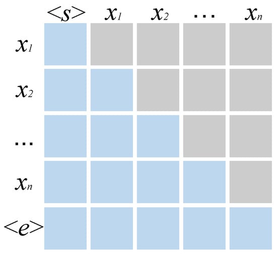 RNNs are well suited for the sequential nature of natural language due to their unique recursive form. However, the attention mechanism and its variants can still achieve sequential prediction if the appropriate mask is chosen. As shown in Figure 10, each row of the attention matrix represents the output, and each column represents the input, where the blue squares represent the input and the gray squares represent the output. Output is thus only related to the starting token , while output in the second row is related to and , and so on, to achieve the idea of recursion.