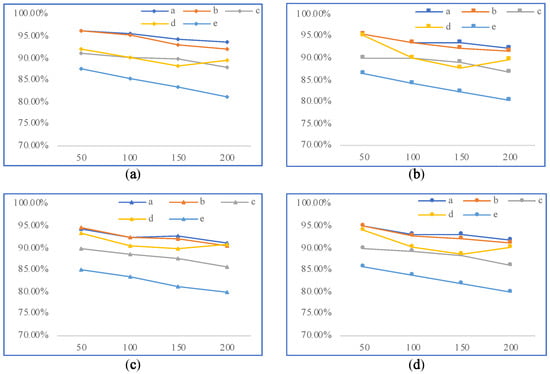 To explore the performance of the model on different instructions, various numbers of samples (50/100/150/200) are randomly selected for testing and are input to the corresponding semantic parsing algorithm, and the generated AOM statements are compared with the actual AOM statements to calculate the relevant performance evaluation index values and the maximum time spent in the instruction parsing process. The test results are shown in Table 3, Table 4, Table 5, Table 6 and Table 7. The trends of their four performance evaluation indicators are shown in Figure 12a–d, respectively.