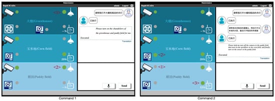 On the desktop platform, there is an indicator light next to the device; the color is gray for off status and green for on status. On the SCADA platform server, the corresponding status of the device will be displayed on the interface. We test two commands here, as shown in Figure 13. Command 1 is ”请帮我打开大棚和稻田的吊灯” (“Please turn on the chandeliers of the greenhouse and paddy field for me”). You can see on the screen that the indicator lights of the chandeliers in the shed and paddy field are changed to green. Command 2 is “请帮我关闭稻田的摄像头, 然后打开玉米地的水泵, 最后打开稻田的传感器” (“Please help me turn off the camera in the paddy field, then turn on the sprinklers in the corn field, and finally turn on the sensor in the paddy field”). On the screen, you can see that the indicator light for the camera in the rice field is gray, the indicator light for the sprinkler in the corn field is green, and the indicator light for the sensor in the rice field is green, next to which the soil moisture is displayed.