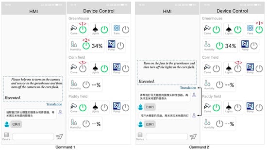 We also tested it on the mobile platform, as shown in Figure 14. First, we enter command 1 on the HMI page: “请帮我打开大棚里的摄像头和传感器, 再关闭玉米地里的摄像头” (“Please help me to turn on the camera and sensor in the greenhouse and then turn off the camera in the corn field”). As you can see on the Device Control page, the cameras and sensors in the shed are turned on, the relative humidity of the soil is displayed next to the humidity sensor, and the cameras in the cornfield are turned off. Then, we enter command 2: “打开大棚里的风扇, 再关闭玉米地的灯” (“Turn on the fans in the greenhouse and then turn off the lights in the corn field”). We can see on the device control screen that the switch for the fan in the shed is turned on, and the switch for the light in the cornfield is turned off.