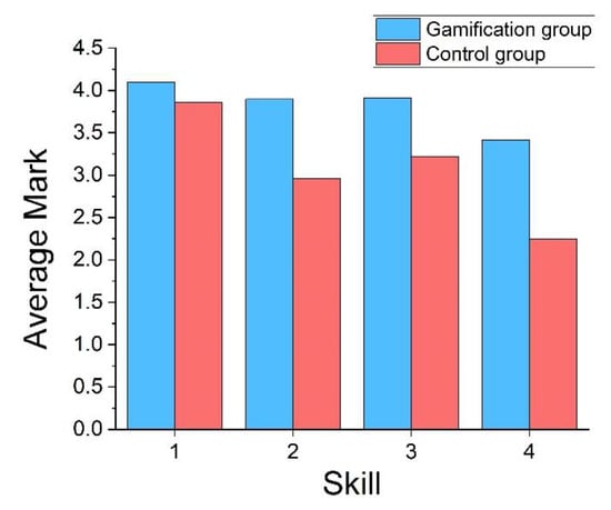 The average marks regarding the Four C’s obtained by students of the gamification and control groups are shown in Figure 1. All marks were higher than 2.5 for all students except for those regarding communication for the students of the control group; the maximum score was five. There was a substantial improvement in the results of the gamification group in comparison with those of the control group, proving that the use of gamification in a classroom can enhance behavior related to the Four C’s. The predominant improvement following the use of Classcraft® was in creativity (from 2.45 to 3.42), followed by communication (from 2.96 to 3.90). It should be also highlighted that critical thinking seemed to be the best skill in both groups.
