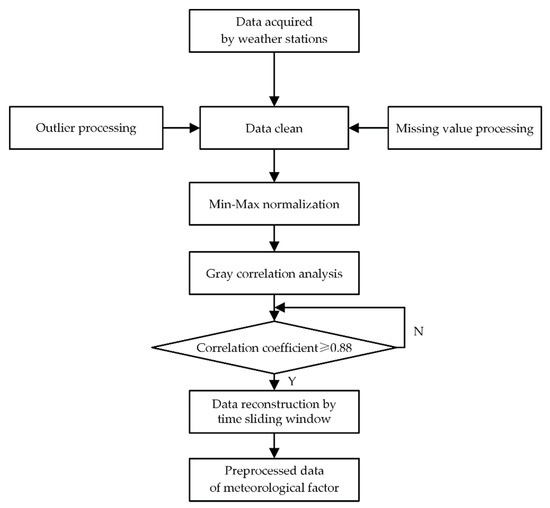 The preprocess starts with data cleaning, including removing meteorological factors such as evaporation that were severely missing, filling in the missing data, and calculating the averages of the 14 days for each week before and after the abnormal values to modify the values. Second, data standardization was implemented by Min-Max standardization to normalize the data and convert them into dimensionless evaluation values. Then, based on the gray correlation analysis (GRA) method, correlation attributes with a correlation degree greater than 0.88 are selected. These include average temperature, average humidity, sunshine duration, precipitation, average wind speed, maximum temperature, average pressure, and date. Finally, data reconstruction was performed using a time-sliding window. In this study, we predict the average temperature and set a time-sliding window to reconstruct the meteorological time series. For example, taking the setting value of the time sliding window as 2, the meteorological factors of days t-1 and t-2 are input into the model. Then, the outputs are the temperatures of day t. In order, the original data are slid backward by 1 and 2 cells, respectively, and the slid meteorological factors together form the new inputs. Figure 1 illustrates the workflow of data preprocessing.