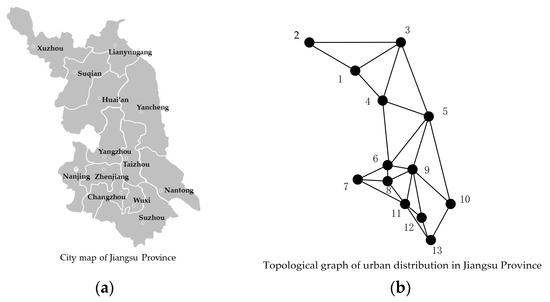 For convenient descriptions, city names are replaced by numbers. The numbers correspond to the cities shown in Table 3. As shown in Figure 2a, Nanjing is adjacent to Zhenjiang and Changzhou, and not adjacent to Nantong. The adjacency network of each city in Jiangsu Province is extracted and depicted, as shown in Figure 2b.