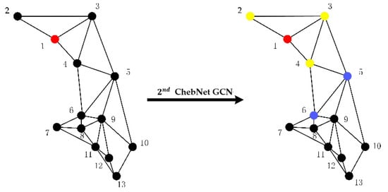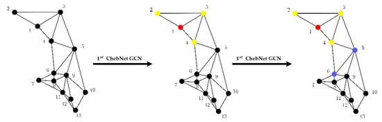 Using the second-order ChebNet graph convolution, the convolution kernel can directly extract information about the surrounding first-order neighboring nodes 2, 3, 4, and second-order neighboring nodes 5, 6 centered on node 1. The detailed implementation process of the second-order ChebNet graph convolution is shown in Figure 4.