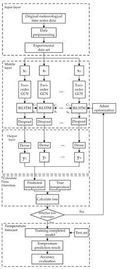 After preprocessing the original meteorological time series data, such as data cleaning and standardization, the data set is divided into training sets, validation sets, and test sets. After the initial data pass through the two-layer GCN network, the feature extraction of meteorological information from the surrounding area is achieved. After this, the information contains spatial features. The output of the previous layer is further fed into the BiLSTM network. Then, the final output is obtained after dropout optimization and 6 fully connected layers. When the input data is the training set, the output values and the actual temperature are used to calculate the loss of mean squared error. The model is continuously optimized by the Adam optimizer. When the input data are the test set, no loss calculation and model optimization are performed, and the output values are the predicted temperature values of the GCN-BiLSTM model. The detailed workflow of the GCN-BiLSTM model is shown in Figure 6.