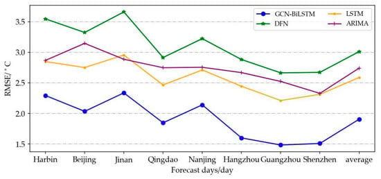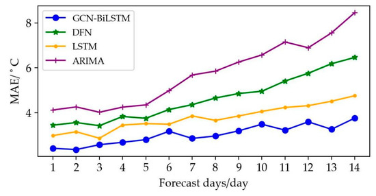 From the 14-day temperature prediction experiments, it can be seen in Table 6 that for the average RMSE and MAE of the temperature forecast for the next 14 days, the GCN-BiLSTM model reaches 2.671 °C and 3.024 °C, respectively. Compared to LSTM, DFN, and ARIMA models, the RMSE value decreased by 23.45%, 38.16%, and 46.48%; the MAE value decreased by 32.61%, 34.15%, and 47.35%, respectively.