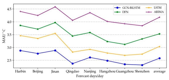 The RMSE and MAE of different models in different cities are shown in Figure 9 and Figure 10. As can be seen in Figure 9, the GCN-BiLSTM model outperforms ARIMA, LSTM, and DFN in temperature prediction in different regions. As in the above analysis, the ARIMA model outperforms the DFN model in terms of RMSE in all research cities. However, for MAE, the result is the opposite. The LSTM model still performs better than the ARIMA model and the DFN model. Comprehensively, the prediction accuracy of the four models has a similar trend, but the GCN-BiLSTM model is more adaptive in each region. This is because the GCN-BiLSTM model can capture the spatial-temporal features of the temperature data in the current region. Specifically, the RMSE of the GCN-BiLSTM model in Hangzhou, Qingdao, Guangzhou, and Shenzhen are lower than the average of the eight cities, while the RMSE in Harbin, Beijing, Jinan, and Nanjing are higher than the average. The GCN-BiLSTM model has the optimal performance for temperature prediction in Guangzhou, with an RMSE of 1.485 °C, which is 22.09% lower than the average. The worst performance for Jinan is 2.337 °C, which is 22.61% higher than the average. As shown in Figure 10, in terms of MAE, the GCN-BiLSTM model performs best for temperature prediction in Guangzhou. In Jinan and Harbin, the MAE is high, and the GCN-BiLSTM model performs well.