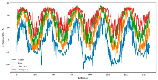 Figure 11 depicts the temperature trends in the four cities of Harbin, Jinan, Hangzhou, and Guangzhou during the five-year period from 1 May 2014 to 1 May 2019. As shown in Figure 11, the temperature difference in Guangzhou is small throughout the year, about 24 °C to 26 °C due to its low latitude, its proximity to the South China Sea, and its subtropical maritime climate. Therefore, the prediction accuracy in Guangzhou is better than in other cities. However, in Harbin and Jinan, the temperature fluctuates throughout the year, with a temperature difference of about 35 °C. The prediction accuracy of the model is lower than in other cities, with more slight fluctuations.