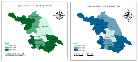 To further explore the spatial correlation of GCN-BiLSTM, the RMSE and MAE of the temperature prediction results for each city in Jiangsu province are spatially visualized, as shown in Figure 12. Hereinto, the average values of RMSE and MAE for the 14-day temperature prediction results are selected in the figure. Cities located at the edge of the study area and with fewer neighbor nodes (including first-order and second-order nodes) have higher prediction errors, such as Suqian and Xuzhou. Cities with more neighbor nodes have smaller prediction errors, such as Yangzhou and Taizhou. GCN is employed to extract the spatial features of the city’s topological maps in our model. If there are more neighbor nodes in the target region, the more features used to extract spatial correlation, the more accurate the prediction will be. However, when the number of neighbor nodes exceeds a certain threshold, the prediction effect does not improve significantly, such as in Yancheng. We consider that when there are too many neighbor nodes, it will bring additional noisy data to affect feature extraction.