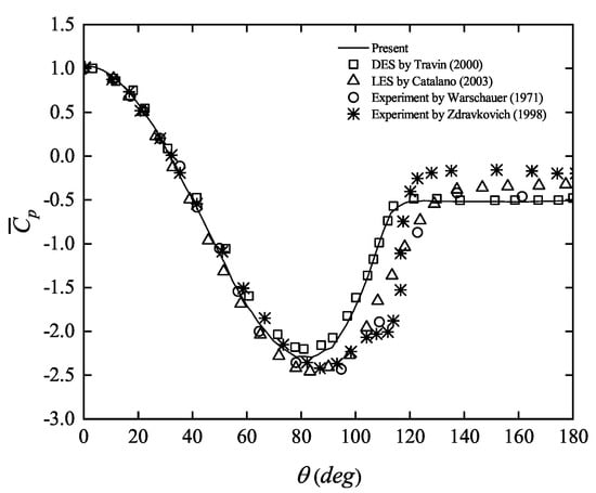 In addition, Figure 4 compares the distribution on a single cylinder with published numerical studies (Travin et al. [44] at and Catalano et al. [45] at ) and experimental studies (Warschauer [47] at and Zdravkovich [48] at ). As shown in Figure 4, the distribution on a single cylinder agrees well with previous results. The skin friction coefficient, , where is the tangential wall shear stress, is presented in Figure 5. The separation point location predicted in the present study agrees well with the previous experimental results [49] and other numerical results [44,46]. The overprediction of for in the present study compared with the experimental values is also observed from other numerical studies which used wall functions [44,45,46]. This results from the wall function method’s assumption of a completely turbulent boundary layer [50].