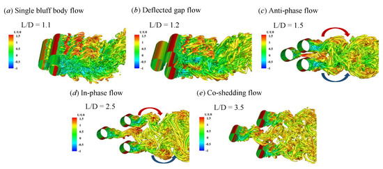 - Five flow regimes are identified depending on the spacing ratios, i.e, single bluff body flow (), deflected gap flow ( = 1.2–1.4), anti-phase flow ( = 1.5–2), in-phase flow ( = 2–3.5), and co-shedding flow ().