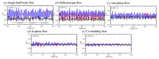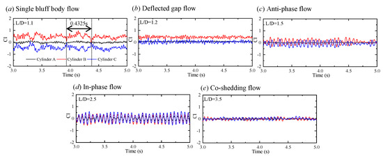 Figure 15c,d presents the mean and fluctuating lift force coefficients for different , respectively. At , Figure 15c illustrates that there is a strong repulsive force between the two downstream cylinders. It is due to the existence of a pressure difference between the gap side and free-stream side of the downstream cylinders, which can be shown distinctly in pressure distributions in the middle section of Figure 14a. As shown in Figure 14a, in the case of downstream cylinder B, for example, the negative pressure zone on its free-stream side is shifted forward, while the negative pressure zone on its gap side is shifted back, which results in an upward lift force. When = 1.2–1.4, the sum of two downstream cylinders lift force coefficients, which is presented by the green line, is not zero, and the absolute value of the sum lift coefficient decreases with the increase of . The direction of the sum lift coefficient is opposite to the direction the deflected flow is biased towards. When , there is a weak attractive force between the downstream cylinders. As goes to 3.5, the lift force coefficients of all cylinders is close to zero, which fits the scenario of a single cylinder. As shown in Figure 15d, similarly to the , the downstream cylinders undergo a higher than that of the upstream cylinder. At , of the downstream cylinder reaches a maximum. At = 1.2–1.4, the downstream cylinder with a wider wake has a larger . As increases, of the downstream cylinders decreases. Similarly to the and distributions, of the three cylinders increases abruptly at and then decreases gradually back to be consistent with that of a single cylinder. We regarded that the special phase lag between all three cylinders at causes the higher , , and . A phase lag of occurring at the early period of the in-phase flow regime enriches the shedding of vortices. The observation of fluid coefficients suggests that the interactions among the three cylinders is apparently strong at single bluff body flow, deflected gap flow, and the start of in-phase flow.