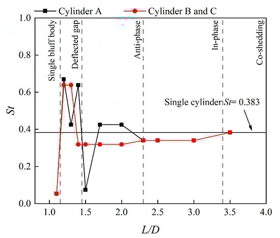 The fluctuation of with is seen in Figure 13. As for the situations with multi-peak spectral densities, the frequency with the largest power density is collected. It is worth noting that cylinders B and C have the same dominant frequency at all ; nevertheless, only one set of data is shown for clarity. The of three cylinders is equal in single bluff body flow, in-phase flow, and co-shedding flow. It reaches the minimum value at . In the in-phase flow regime, the value of is 0.340, which is of that for a single cylinder. In the co-shedding flow regime, equals that for a single cylinder, demonstrating that is a crucial spacing ratio of the two flow regimes.