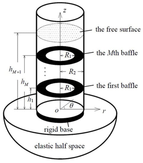 A cylindrical tank resting on soil is partially full of incompressible, irrotational and inviscid liquid in Figure 1. Multiple rigid annular baffles are positioned on the tank wall. The soil foundation is considered as the half space. The rigid tank is supported on the circular base whose radius is the same as that of the storage tank. The cylindrical coordinate system with the origin located at the bottom center is employed to describe the movement for the soil–tank system undergoing a horizontal motion. Due to small amplitude for free surface under small earthquake, the linear liquid sloshing is considered. The influences of the baffle thickness on the sloshing can be overlooked. The number of anti-sloshing baffles is considered as . and are radiuses of the baffles and tank, respectively. The baffles are, respectively, positioned at and h0 are the fluid height and the tank bottom, respectively. According to the subdomain partition method [17,18], the subdomains of liquid are determined with M circular and cylindrical interfaces, as shown in Figure 2. The velocity potential for fluid yields