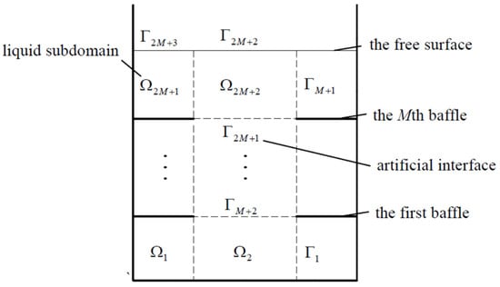 where and are free surfaces for subdomains and respectively. The M circular artificial interfaces from bottom baffle to top one are identified as The M + 1 cylindrical artificial interfaces from bottom to top are identified as .