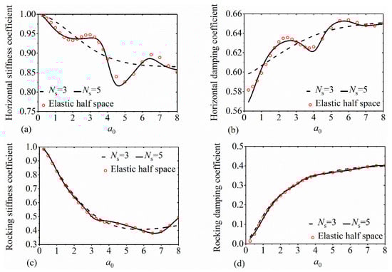 Impedance of the circular surface foundation for varying dimensionless frequencies a0 in comparison with the elastic half space results [28]: (a) horizontal stiffness coefficient; (b) horizontal damping coefficient; (c) rocking stiffness coefficient; (d) rocking damping coefficient.