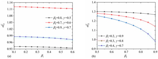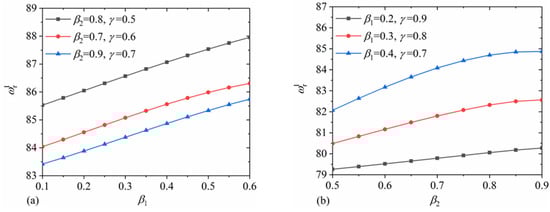 The first-order convective frequency for the baffle height: (a) the height of the lower baffle β1; (b) the height of the upper baffle β2.