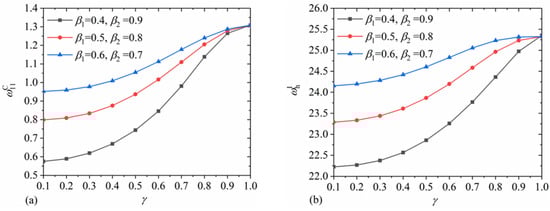 The rotational impulsive frequency for the baffle height: (a) the height of the lower baffle β1; (b) the height of the upper baffle β2.