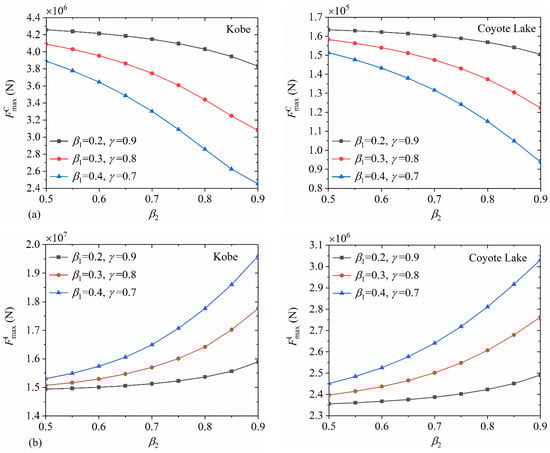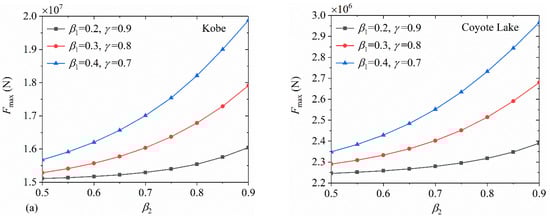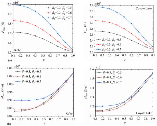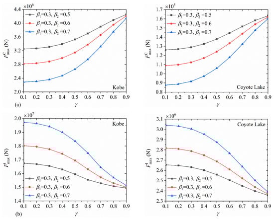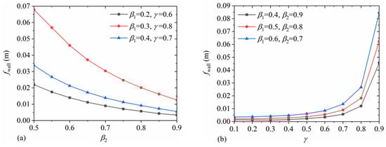 Amplitudes for the surface height at the tank wall fmax: (a) under the upper baffle height β2; (b) under the baffle inner radiuses γ.