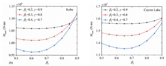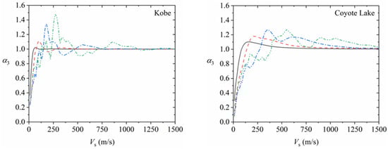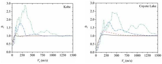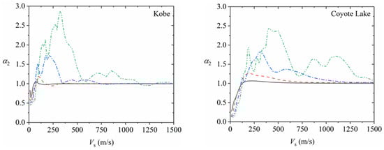 For the NF and FF seismic excitation, the ratios and are investigated in Figure 15, Figure 16 and Figure 17 with different vs. for M = 2 and R2 = 10 m. It is observed that the amplitudes of the seismic responses do not vary monotonically with the increase in Vs. The values of and at lower shear wave velocities (representative of more flexible soils) are relatively larger than those at greater shear wave velocities (stiffer soils), showing that soil–tank interaction magnifies the tank response. For Kobe wave excitation, the maximum values of and occur at Vs equal to 320 m/s and ; for Coyote Lake wave excitation, the maximum values of and appear at equal to 400 m/s and . The phenomenon that the peak values pertaining to the shear wave velocity of the soil deviate under the two excitations may be attributed to the fact that the predominant frequencies of NF and FF seismic motions are different. Then, by further increasing the shear wave velocity of the soil, the values of and for both decline typically. The peak values of and both increase as the fluid height increases from to . The magnification is a factor of both the shear wave velocity of soils (greater magnification for flexible soils) and the geometry characteristic of tanks (greater magnification for tall tanks). With an increase in soil stiffness, the values of and approach 1.0, indicating that the responses with respect to soils vanish.